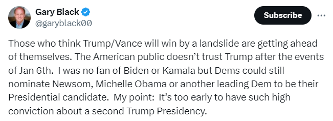 “Những ai nghĩ rằng Trump/Vance sẽ thắng lớn đang quá vội vàng,” Black viết trong bài đăng ngày 22 tháng 7 trên X: