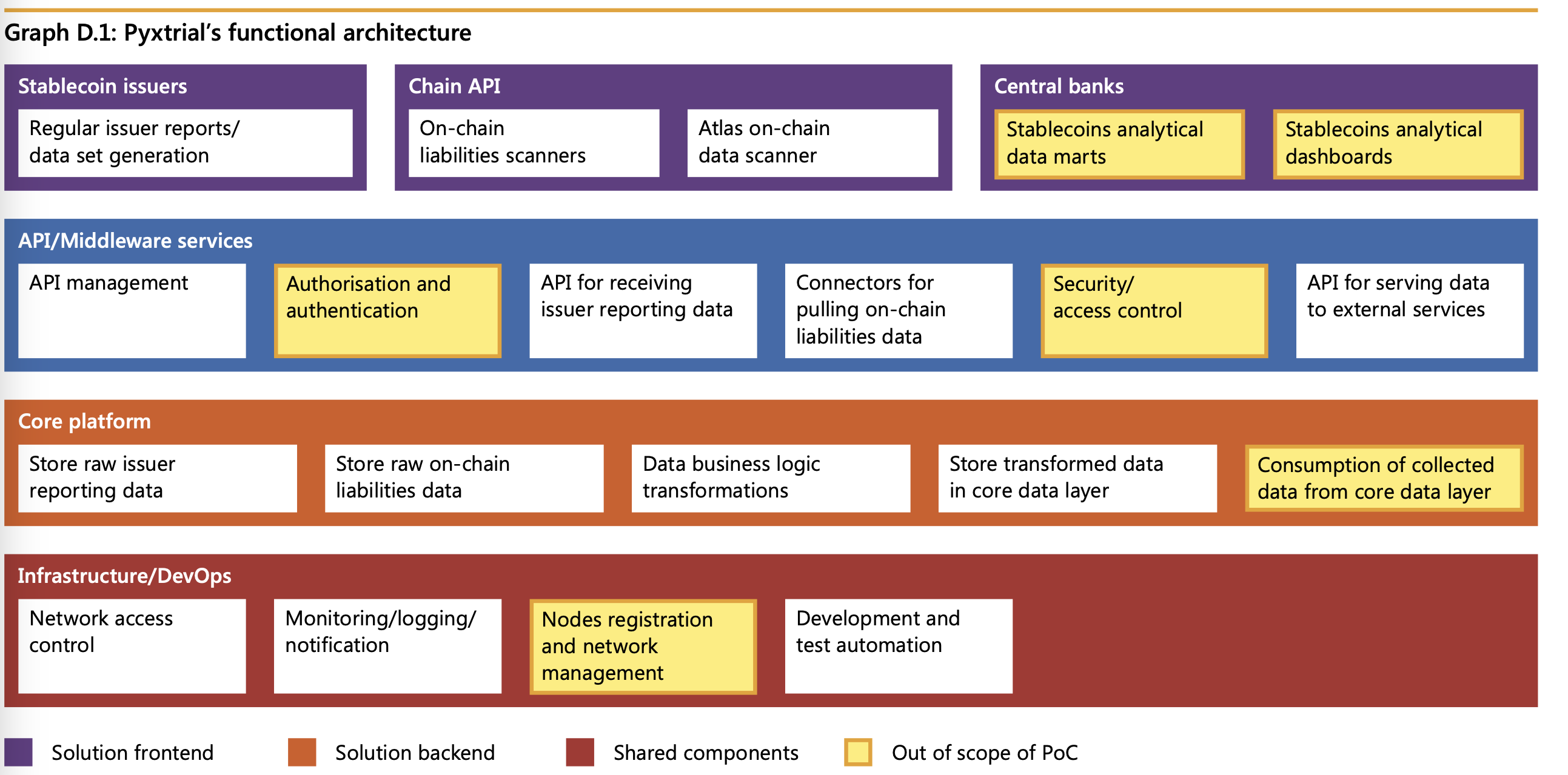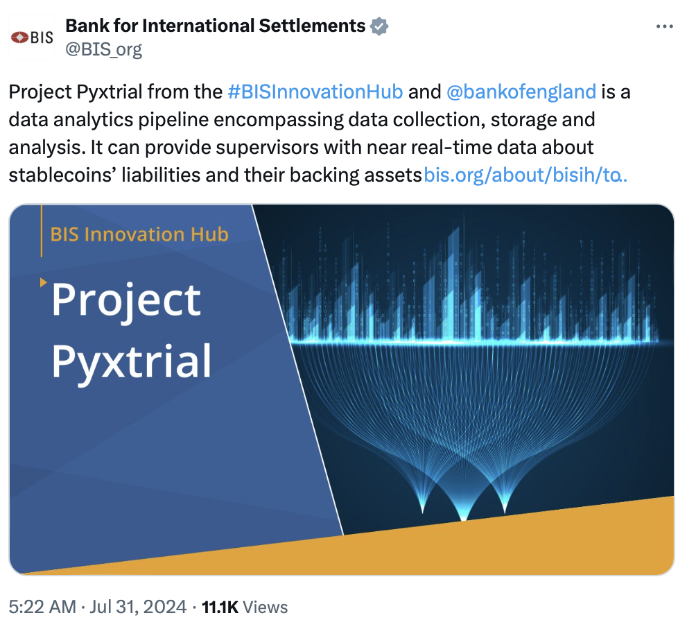 Ngân hàng Thanh toán Quốc tế (BIS) và Ngân hàng Anh đã công bố kết quả của Dự án Pyxtrial, nhằm giám sát dự trữ của các stablecoin được bảo đảm bằng tài sản và các tài sản được mã hóa. Pyxtrial được mô tả là một bằng chứng khái niệm và là một “bước đầu quan trọng.”
