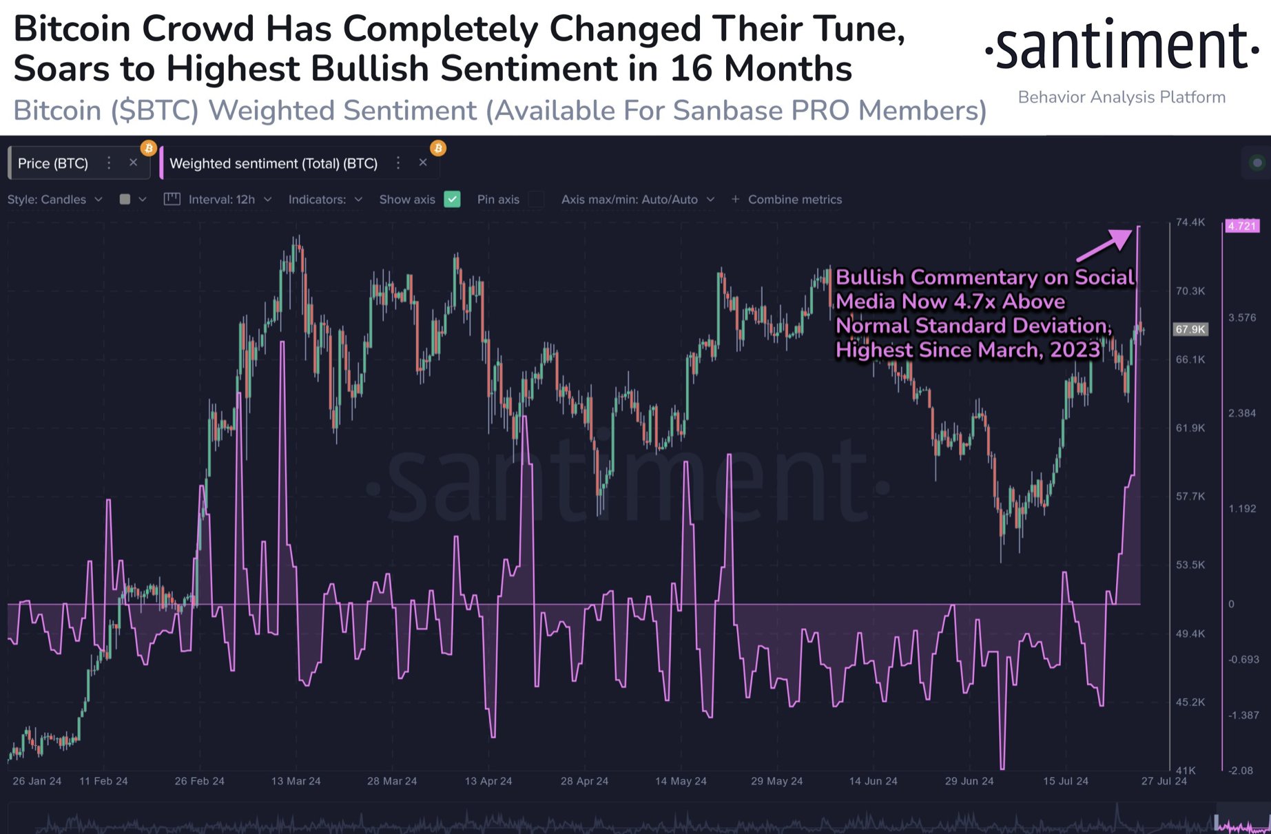 “Đợt tăng giá +20% trong 3 tuần qua đã khiến các nhà giao dịch cảm thấy lạc quan hơn nhiều so với đầu tháng,” Santiment viết trong một bài đăng trên X ngày 27 tháng 7. Bitcoin