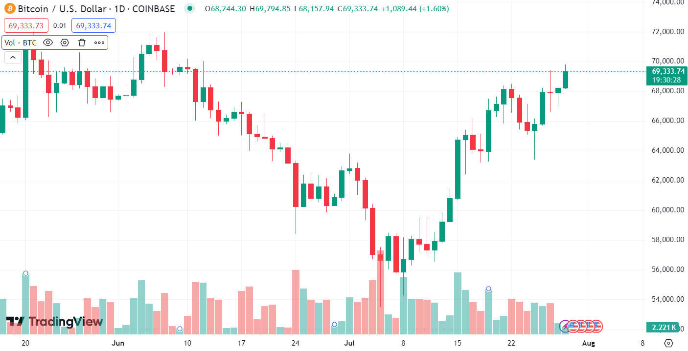 Giá Bitcoin đã tiến gần đến mốc $70,000 vào ngày 29 tháng 7, đạt mức cao nhất trong bảy tuần và thiếu đỉnh lịch sử của nó khoảng 6%.
