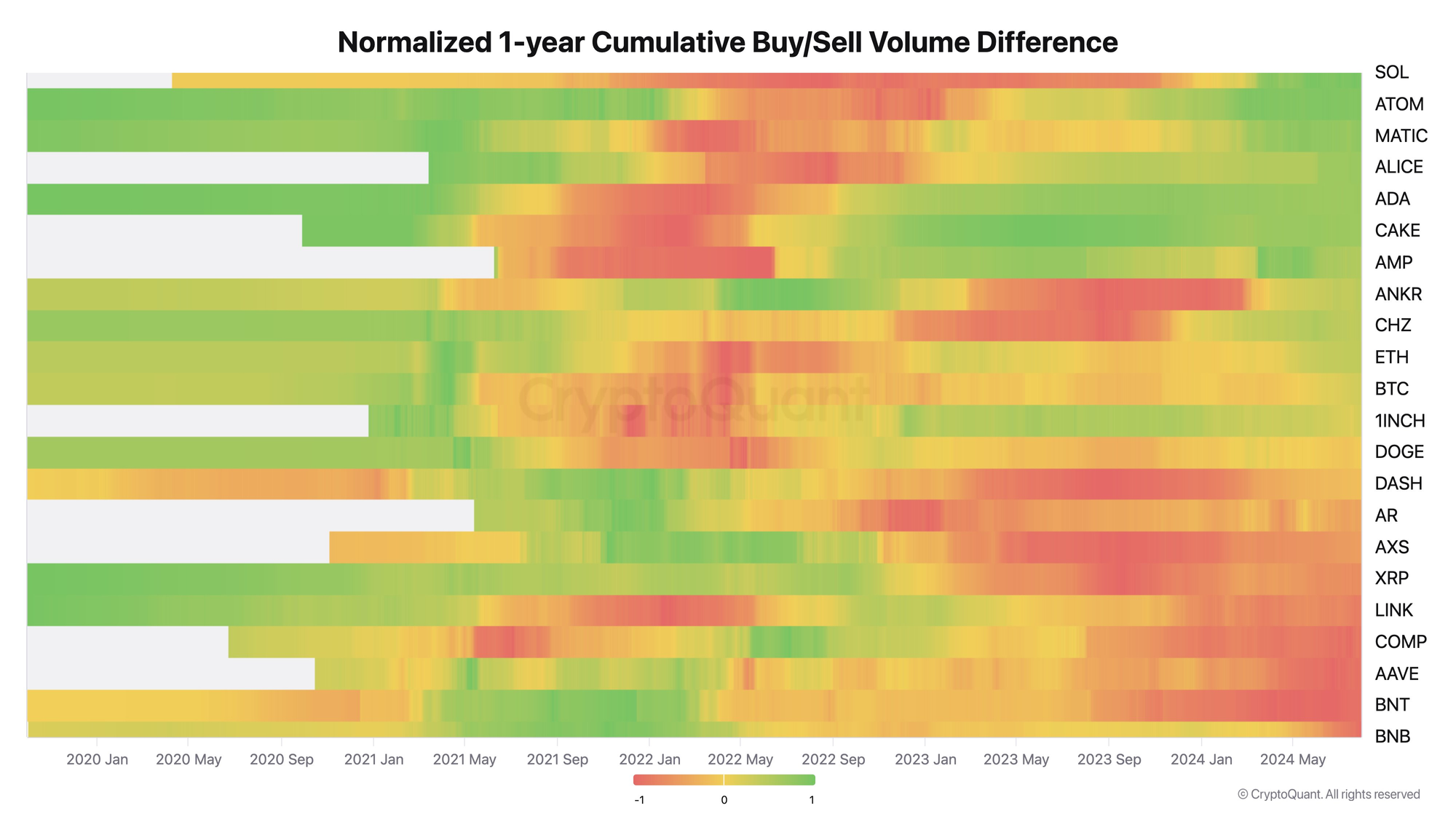 Phân tích của Ju tập trung vào Chỉ Số Khối Lượng Mua/Bán Tích Lũy Trong 1 Năm Cho Altcoin, một chỉ số đo lường sự chênh lệch giữa các lệnh mua và bán với khoảng thời gian một năm.
