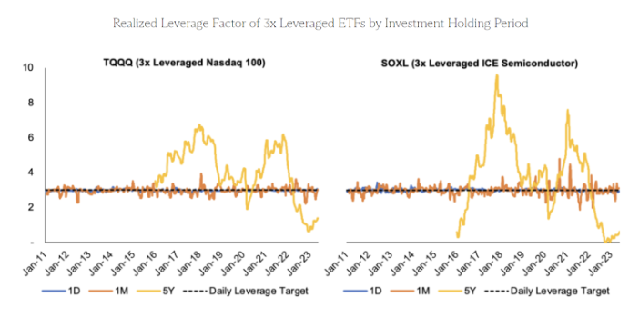 Báo cáo cho biết điều này phần nào là do hiện tượng được gọi là bẫy đòn bẩy liên tục, trong đó các quỹ buộc phải mua thấp và bán cao để duy trì mục tiêu đòn bẩy cố định. Các ETF đòn bẩy cũng thường tính phí quản lý tương đối cao, làm giảm hiệu suất thêm.