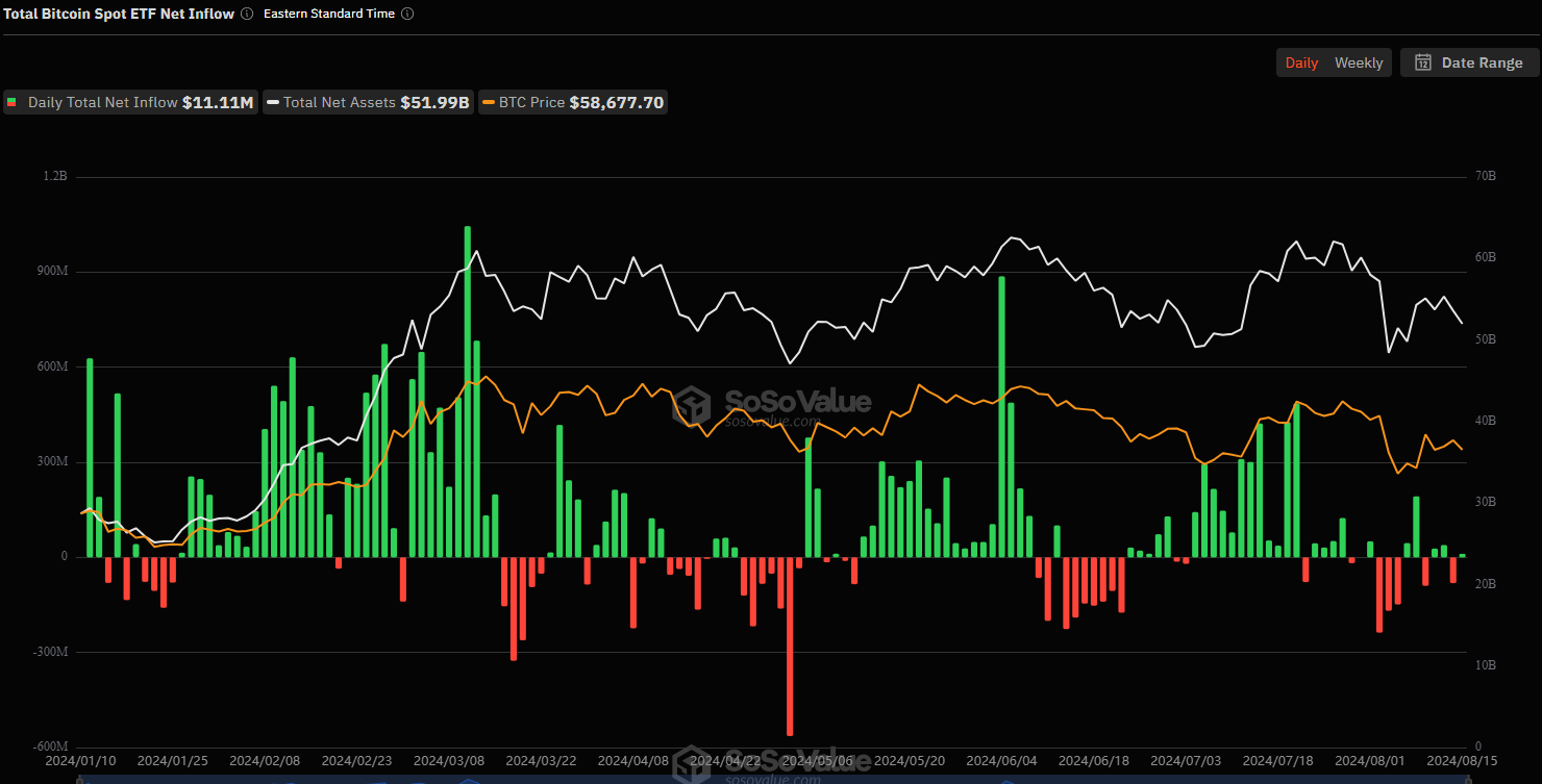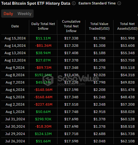 Dữ liệu Sosovalue cho thấy dòng tiền ròng hàng ngày $11 triệu vào ngày 15 tháng 8. Nguồn: Sosovalue