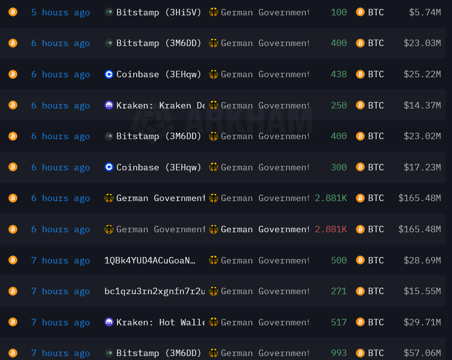 Các chuyển khoản từ Coinbase, Bitstamp và Kraken trở lại ví của chính phủ Đức vào ngày 11 tháng 7. Nguồn: Arkham
