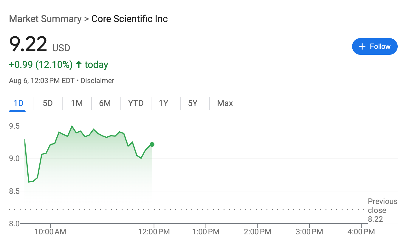 CORZ giao dịch trên Nasdaq vào ngày 6 tháng 8. Nguồn: Google Finance