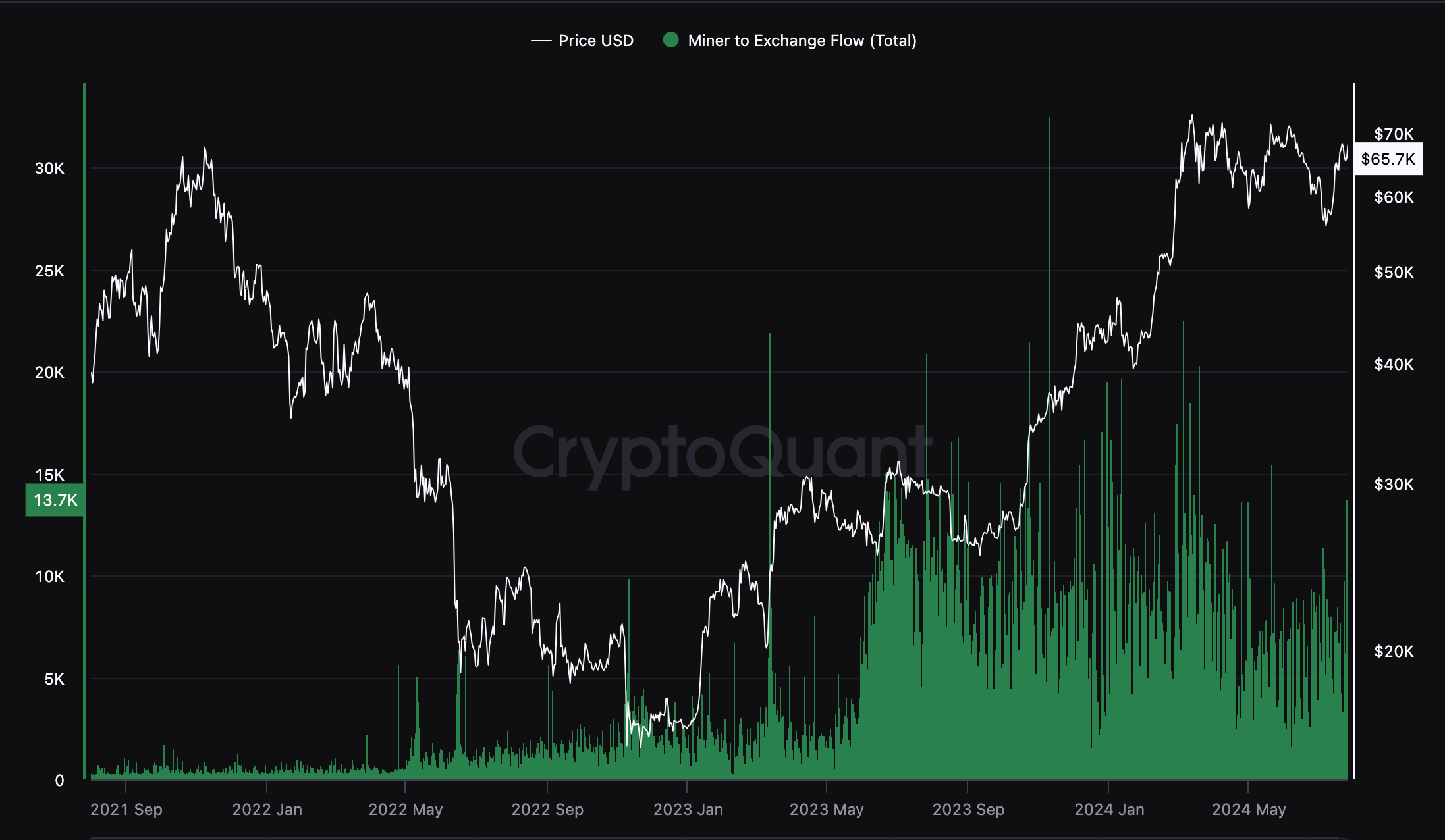 Theo CryptoQuant, chỉ số Dòng BTC Từ Miner Đến Sàn, một chỉ số theo dõi số lượng BTC gửi đến các sàn giao dịch từ các miners, đã tăng vọt lên 13,729 BTC vào ngày 24 tháng 7 nhưng vẫn duy trì ở mức tương đối thấp so với các dòng chảy BTC từ miner được ghi nhận từ tháng 1 đến tháng 4 năm 2024.