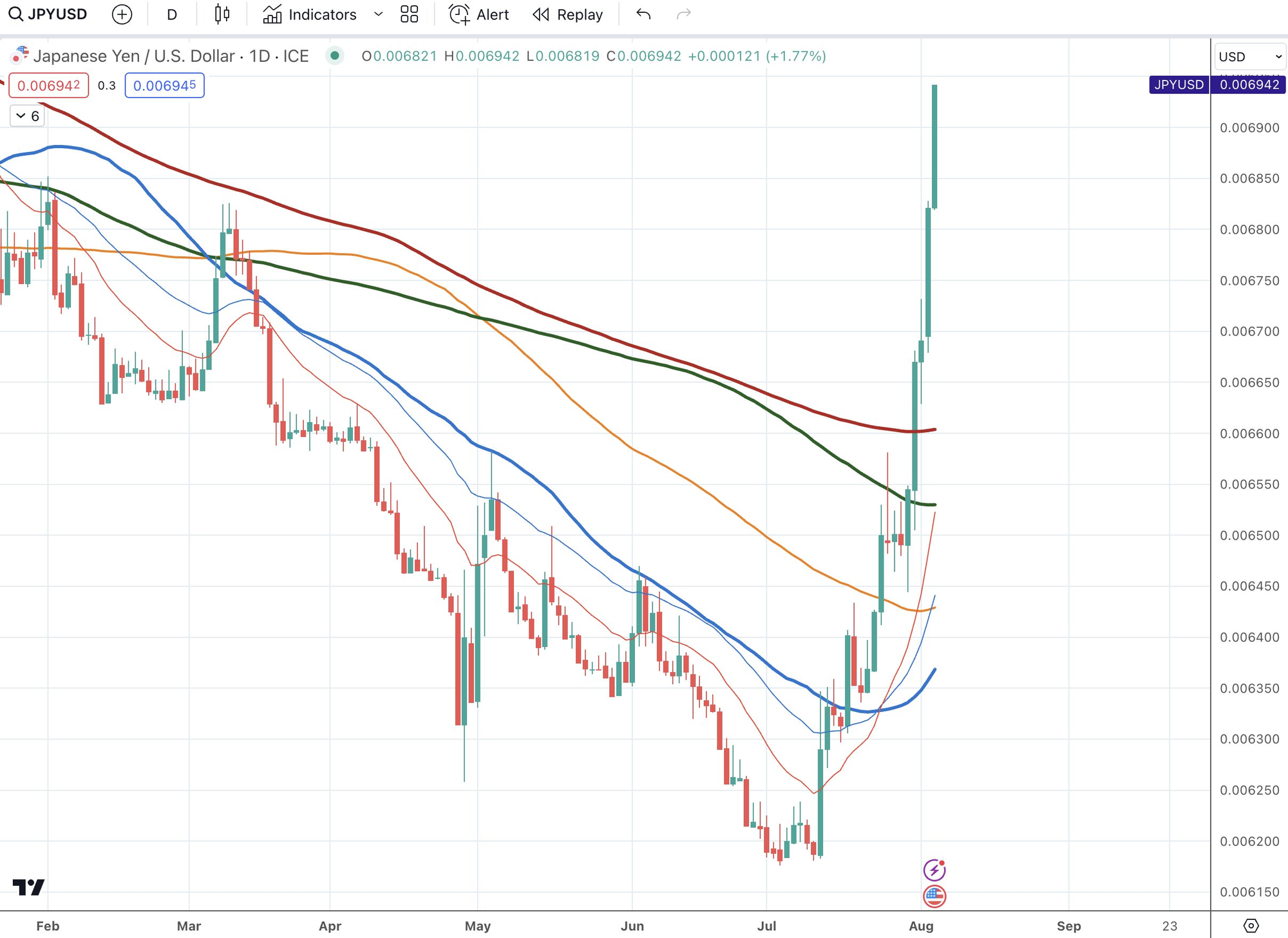 Giá trị của đồng yên tăng vọt sau khi BoJ tăng lãi suất. Nguồn: Adam Khoo