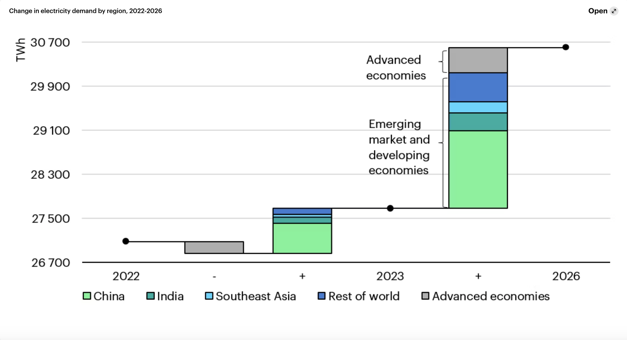 Thay đổi trong nhu cầu điện năng theo khu vực, từ 2022 đến 2026. Nguồn: IEA