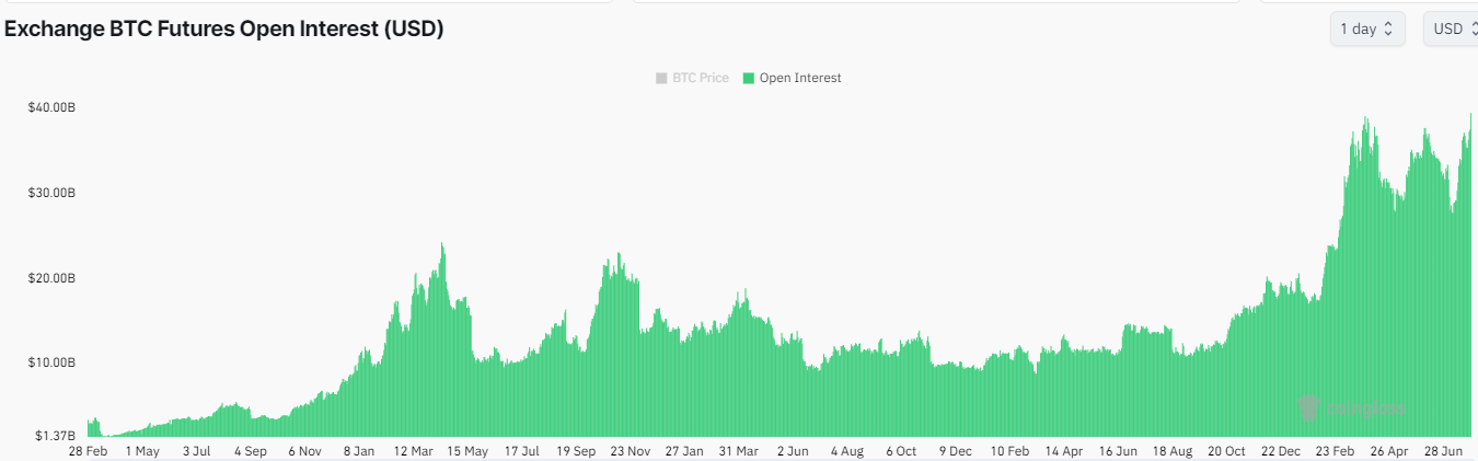 Dòng vốn mở của Bitcoin, một chỉ số theo dõi tổng số vị thế mở trong tài sản cơ sở, đã đạt mức kỷ lục $39,46 tỷ trên tất cả các sàn giao dịch.