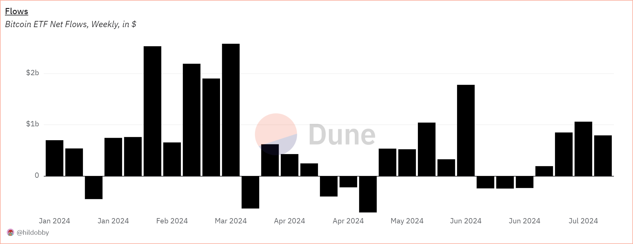 Dòng vốn ròng ETF Bitcoin, theo tuần, tính bằng đô la Mỹ. Nguồn: Dune