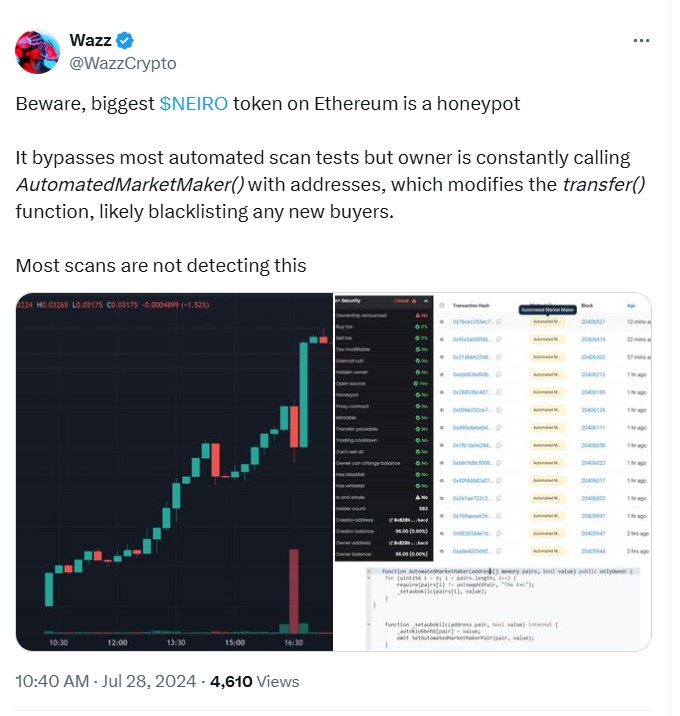 Nhà điều tra blockchain độc lập Wazz đã đăng một cảnh báo công khai vào ngày 28 tháng 7, tuyên bố rằng “token Neiro lớn nhất trên Ethereum là một bẫy mật ngọt.”