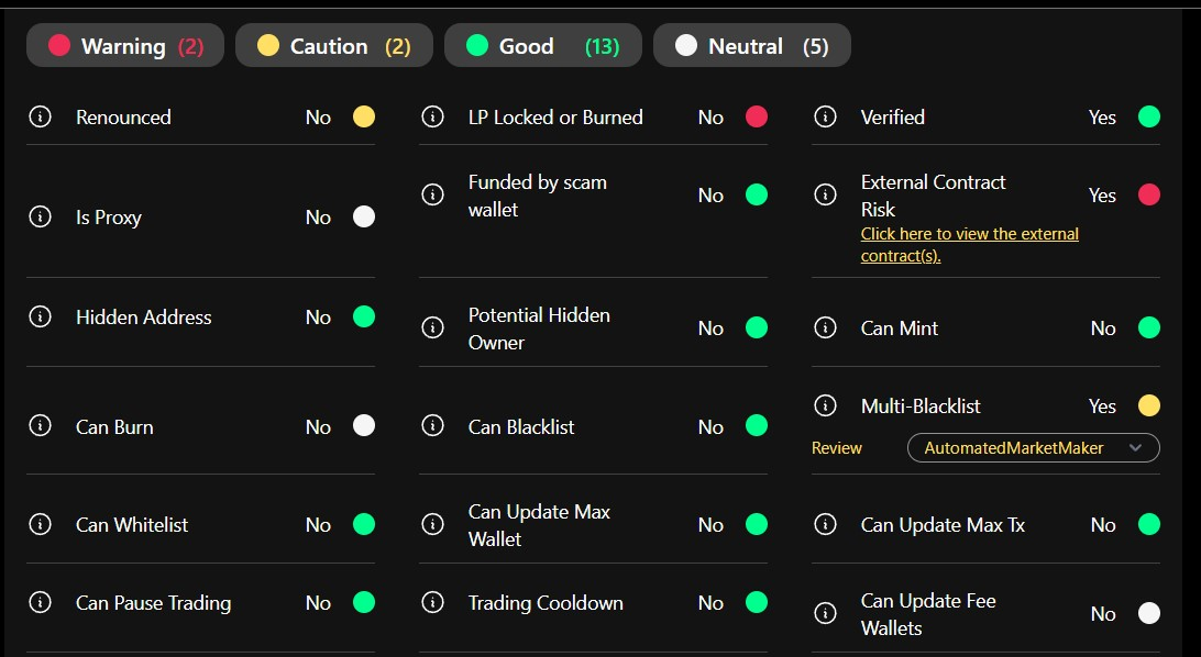 Các chỉ số đáng ngờ khác cho thấy token có kết nối trực tiếp đến các ví ngoài hệ sinh thái của nó và rằng pool thanh khoản của nó không được khóa, có nghĩa là quỹ có thể bị rút cạn bất cứ lúc nào.