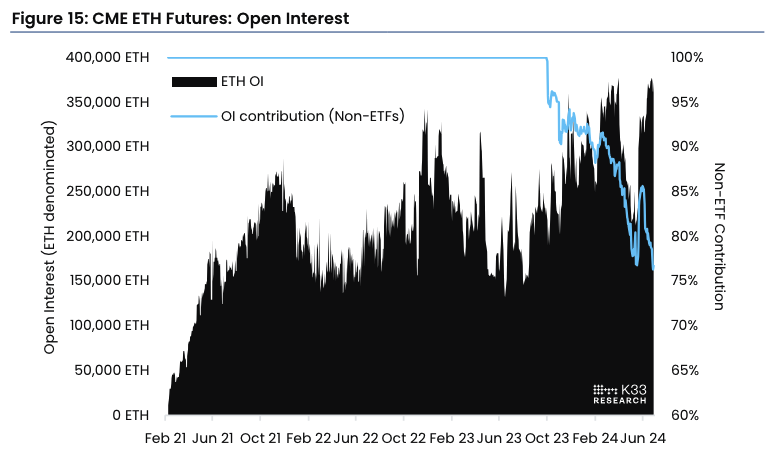 Tuy nhiên, Lunde và Zimmerman cho biết lãi suất mở của hợp đồng tương lai Ether vẫn “bền bỉ,” cho thấy nhiều nhà giao dịch đang sử dụng đòn bẩy cao để đặt cược vào khả năng hành động giá của ETH trước khi các quỹ ETF ra mắt.