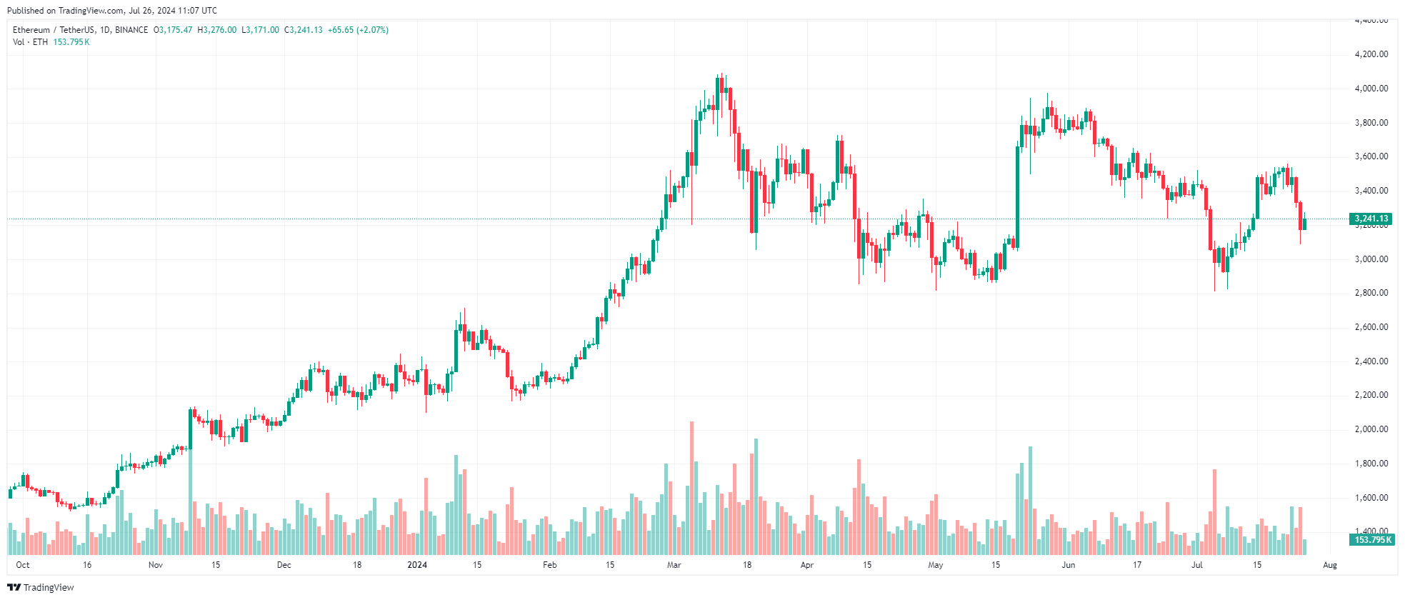 Giá Ether đã tăng hơn 2.3% trên biểu đồ hàng ngày nhưng giảm hơn 4.5% trong tuần qua, giao dịch dưới mức $3,250 tính đến 11:02 sáng UTC, theo dữ liệu từ CoinMarketCap.