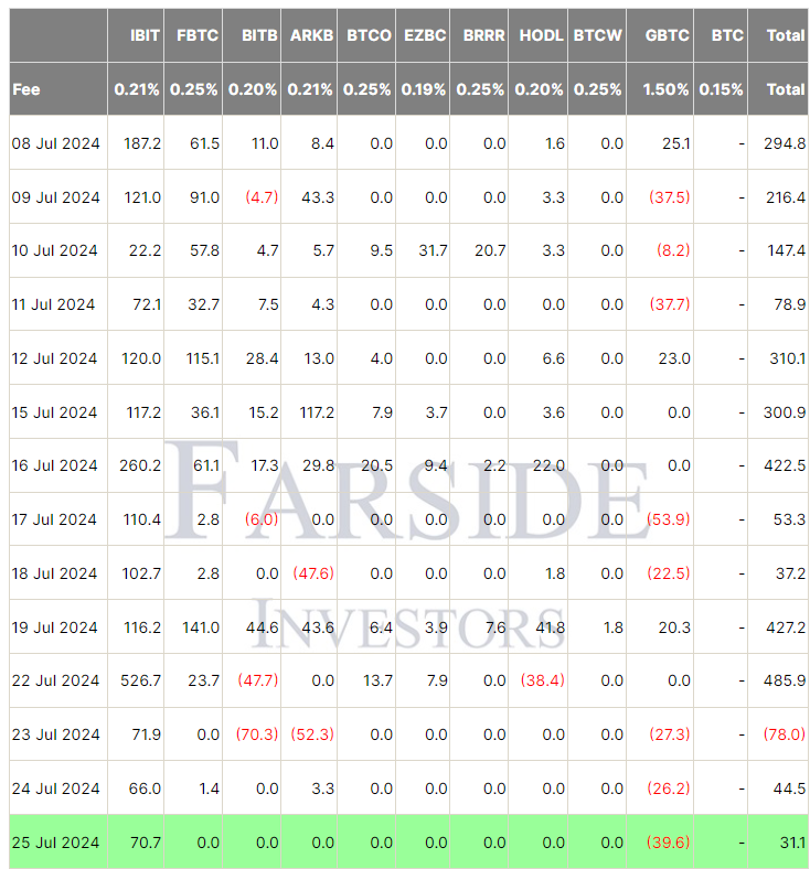 Dòng tiền tích cực vào ETF Bitcoin có thể góp phần vào động lực của Bitcoin. Các ETF Bitcoin giao dịch trên sàn ở Mỹ đã ghi nhận ngày thứ hai liên tiếp có dòng tiền tích cực, với tổng cộng $31.1 triệu vào ngày 25 tháng 7, theo dữ liệu từ Farside Investors.