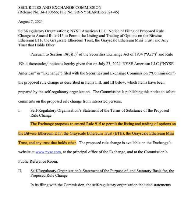 Vào ngày 7 tháng 8, NYSE American LLC đã đề xuất một thay đổi quy tắc cho phép niêm yết và giao dịch tùy chọn cho ba ETF Ether do các công ty quản lý tài sản tiền điện tử Grayscale và Bitwise vận hành. Trong hồ sơ gửi lên SEC, NYSE American yêu cầu SEC "cho phép niêm yết và giao dịch tùy chọn" cho Bitwise Ethereum ETF (ETHW), Grayscale Ethereum Trust (ETHE) và Grayscale Ethereum Mini (ETH).