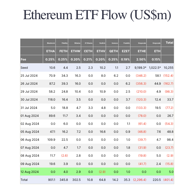 Vào ngày 12 tháng 8, quỹ ETF Ether giao ngay tại Mỹ đã ghi nhận dòng vốn vào tích cực lần thứ năm kể từ khi ra mắt vào ngày 23 tháng 7, nhờ vào việc ETHE không có bất kỳ dòng rút tiền nào trong ngày đầu tiên, theo dữ liệu từ Farside.