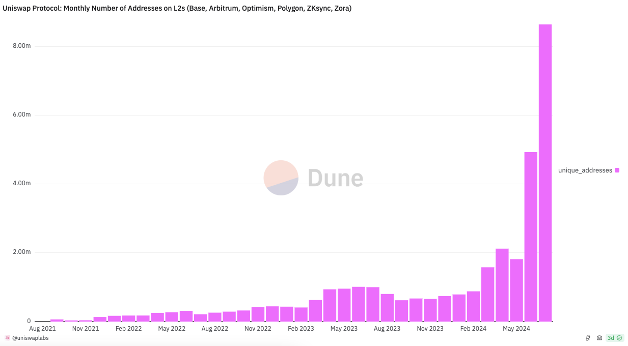 Uniswap ghi nhận tổng cộng 8,65 triệu địa chỉ mới được tạo trên các mạng lớp 2 trong tháng 7, gần gấp đôi so với 4,93 triệu địa chỉ được thêm vào trong tháng 6, theo dữ liệu từ Dune Analytics.