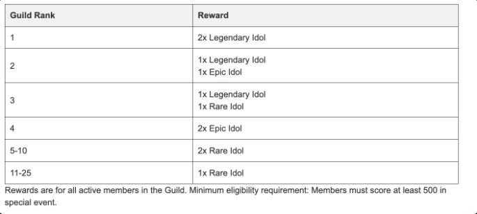 Guilds stand to gain significantly from the event, with the top-ranking guild rewarding its members with multiple Legendary Idols. Rewards scale down through the top twenty-five guilds, while individual players earn Ascension Seals and various Idols based on their leaderboard positions.
