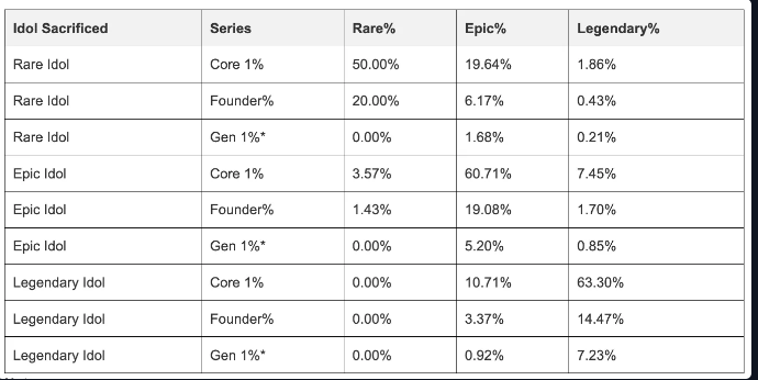 The Idol Sacrifice feature enriches gameplay by empowering players to expand their Guardian collections through strategic sacrifices of Epic and Legendary Idols. Each type of Idol offers distinct odds for minting Guardians of varying rarity, highlighting the exclusivity and value of Founder Guardians, sourced exclusively from the Developer's 10% promotion budget.