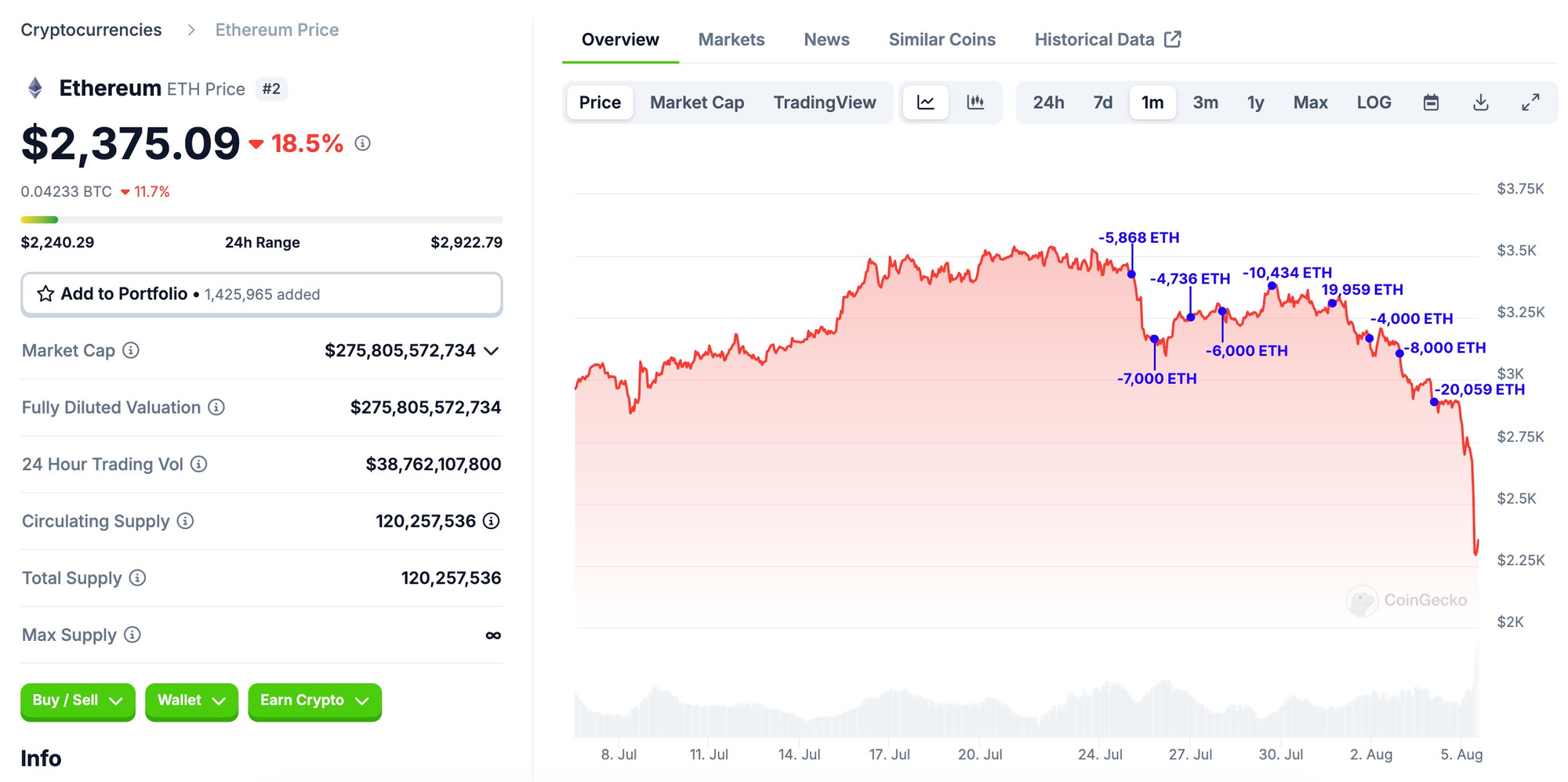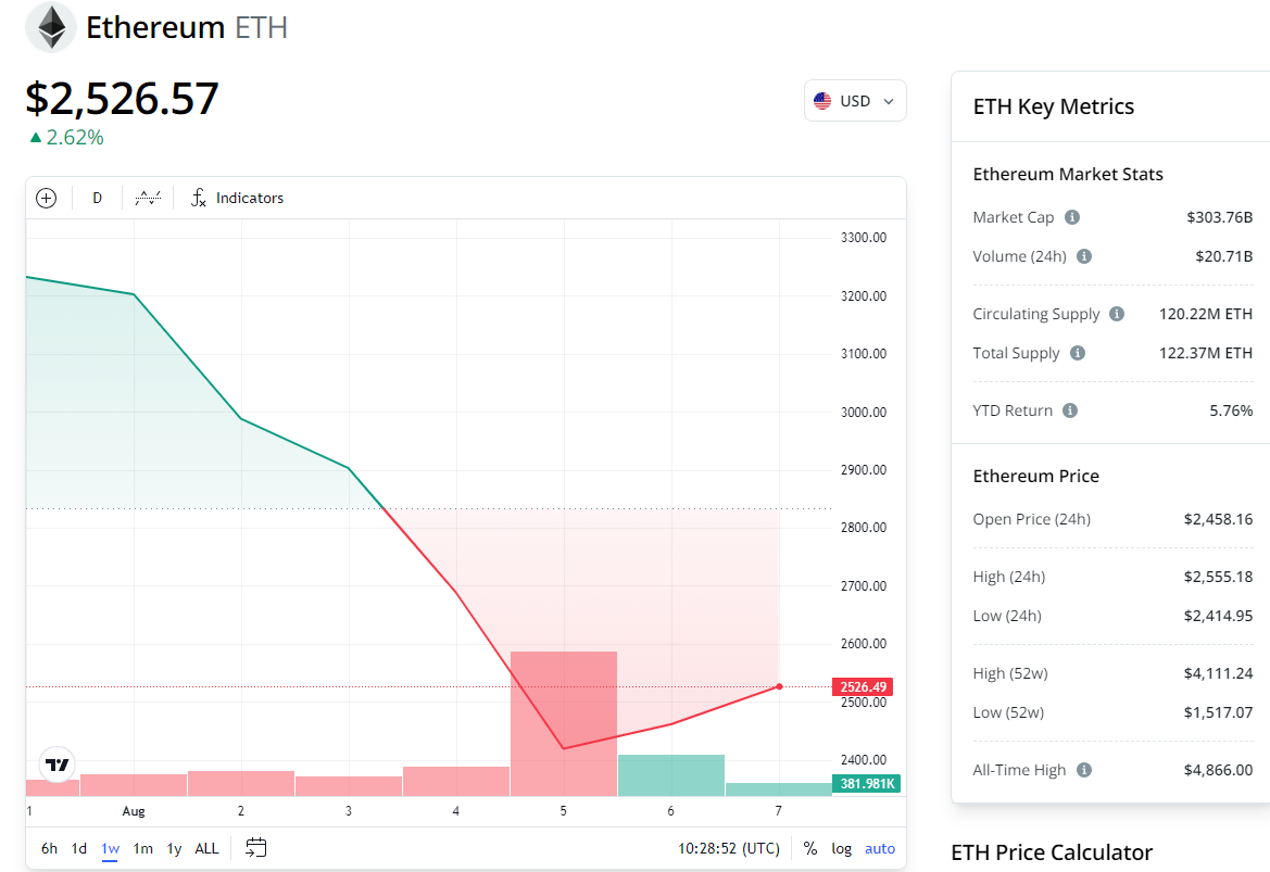 Đối với Ether, token này vẫn giảm hơn 23% trên biểu đồ tuần, nhưng đã có một đợt phục hồi nhỏ, tăng 3.29% trên biểu đồ hàng ngày, giao dịch ở mức $2,533 tính đến 10:28 sáng UTC, ngày 7 tháng 8.