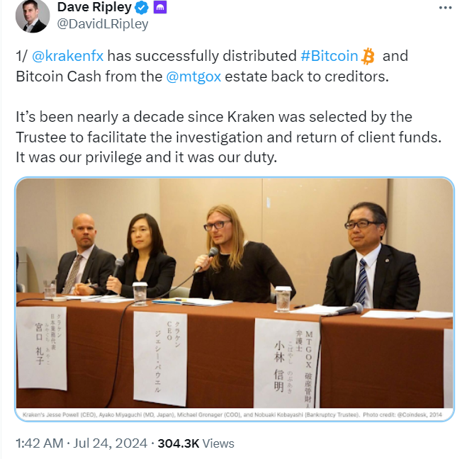 “Krakenfx đã hoàn tất việc phân phối #Bitcoin và Bitcoin Cash từ tài sản của Mt. Gox về tay các chủ nợ. Đã gần một thập kỷ kể từ khi Kraken được lựa chọn bởi Người quản lý để hỗ trợ điều tra và trả lại tiền của khách hàng.”