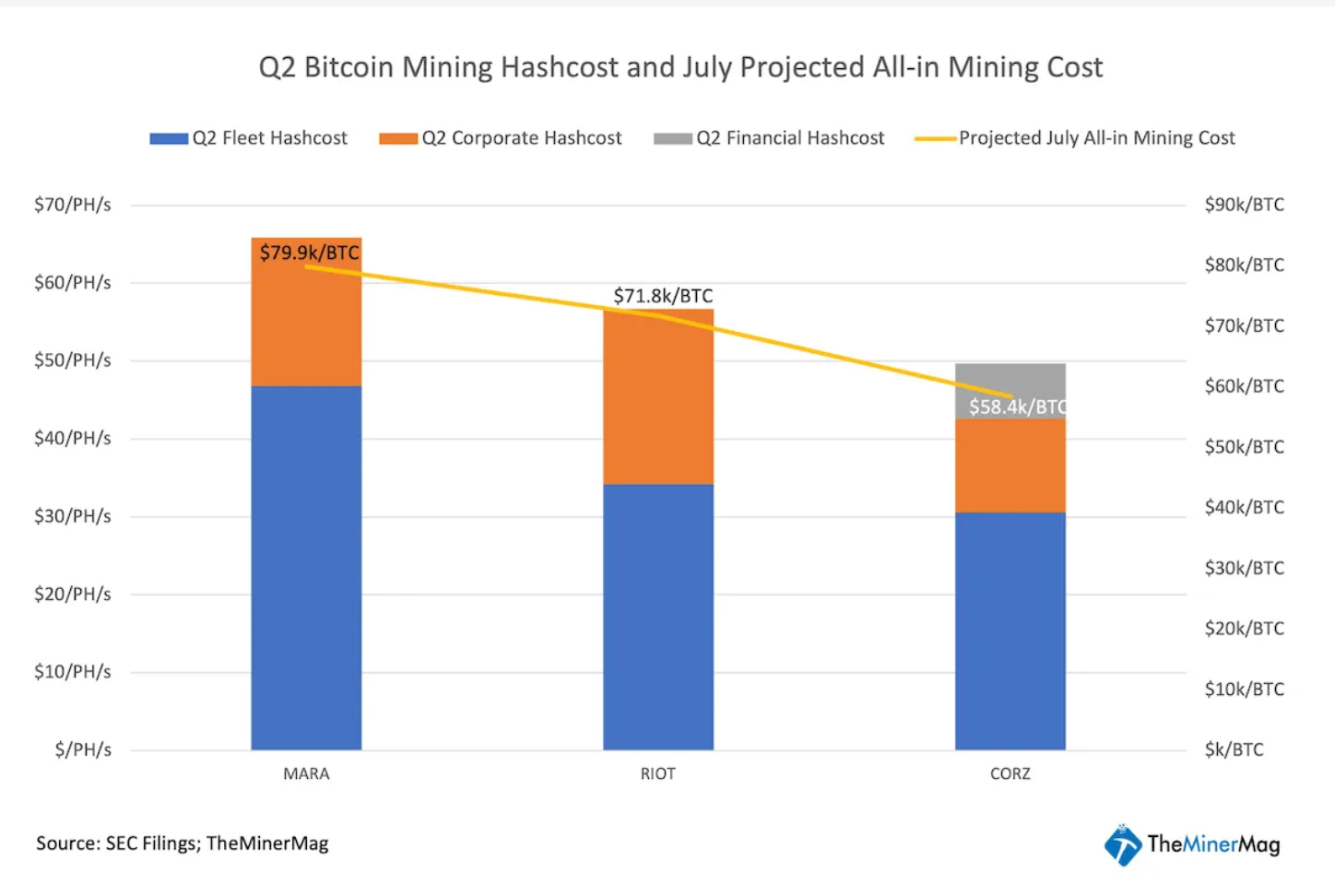 Hầu hết các công ty khai thác công khai lớn cũng sẽ gặp khó khăn trong việc có lợi nhuận với hashprices hiện tại, với MARA, Core Scientific và Riot Platforms mỗi công ty dự tính chi phí khai thác hàng tháng trên mỗi Bitcoin lên tới 60.000 đô la hoặc hơn. Dữ liệu tài chính quý hai cho thấy MARA có chi phí khai thác cao nhất cho tháng 7.