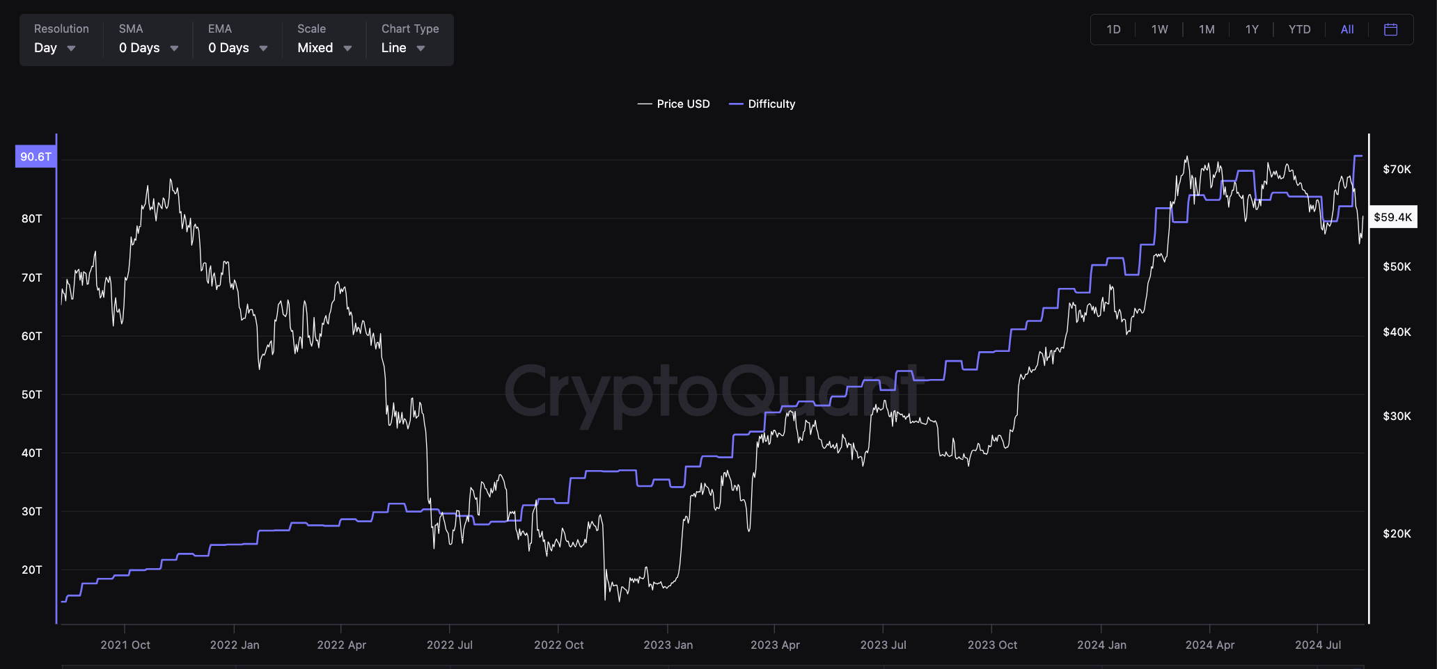 Độ khó khai thác Bitcoin gần đây đã đảo ngược vài tháng giảm tương đối và đạt mức cao kỷ lục mới khoảng 90,6 triệu tỷ vào ngày 1 tháng 8.