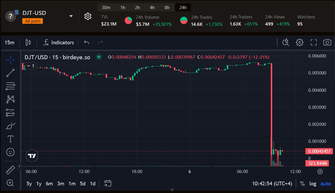Vào ngày 6 tháng 8, TrumpCoin (DJT) giảm từ $0.00555/token xuống $0.000229 trước khi hồi phục nhẹ. Đây là mức giảm 95% so với giá trước đó. Tại thời điểm viết bài, giá hiện đang dao động quanh mức $0.000430/token.
