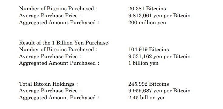 Nhờ vào kế hoạch mua Bitcoin trị giá 1 tỷ yen, công ty đã mua được 104,91 BTC, với giá trung bình là 9.531.162 yen (khoảng 60.700 USD) mỗi Bitcoin. Tổng số Bitcoin nắm giữ của công ty hiện tại là 245,99 BTC, trị giá 16,5 triệu USD theo giá thị trường hiện tại.