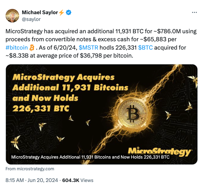 MicroStrategy là một trong những tổ chức công cộng nắm giữ Bitcoin lớn nhất thế giới. Tính đến ngày 20 tháng 6, công ty này nắm giữ tổng cộng 226.331 BTC, mua với giá khoảng 8,33 tỷ USD, trung bình 36.798 USD mỗi đồng.