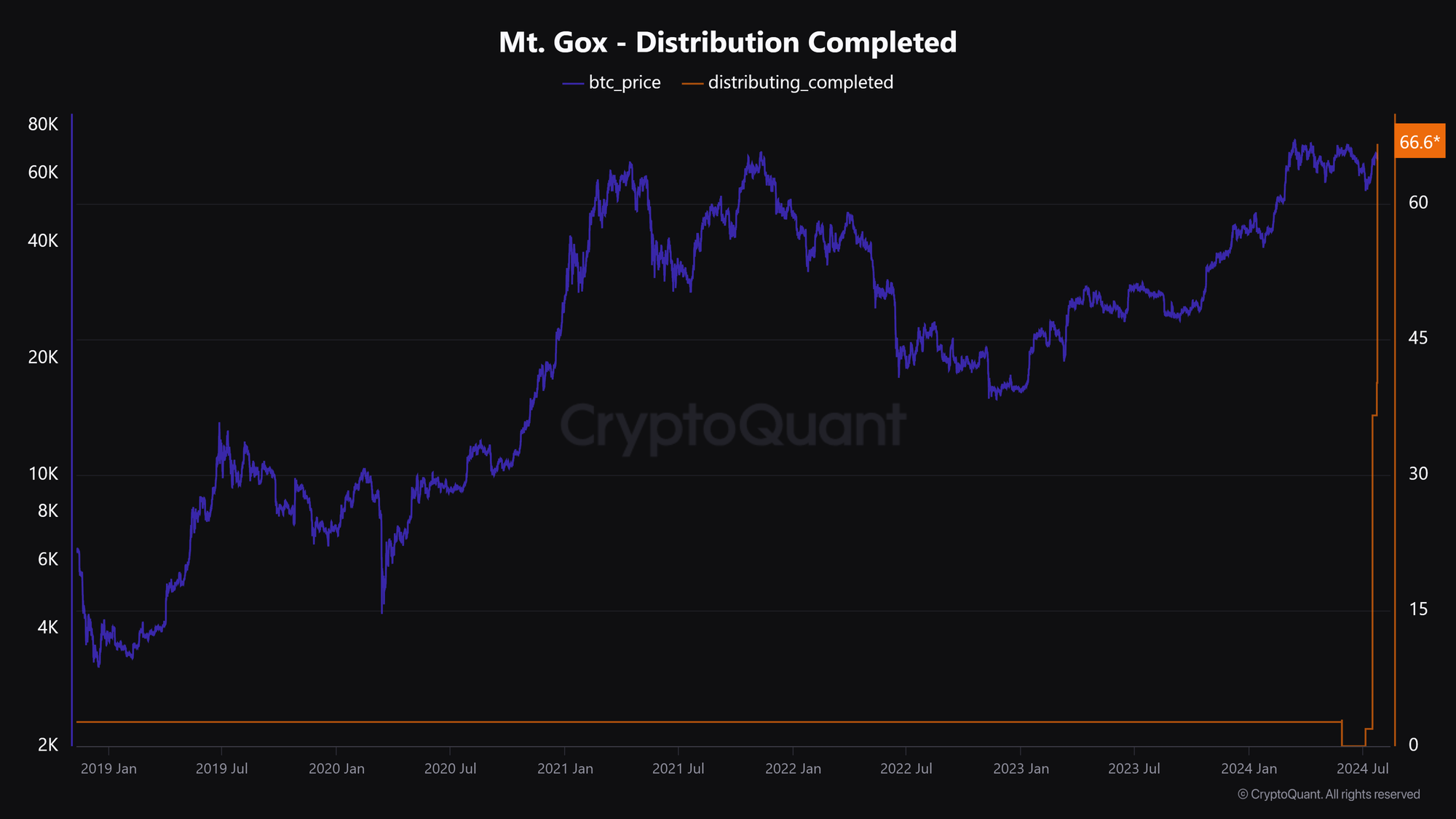 Theo dữ liệu từ CryptoQuant, hơn 66% số BTC nợ các chủ nợ của Mt. Gox đã được phân phối.