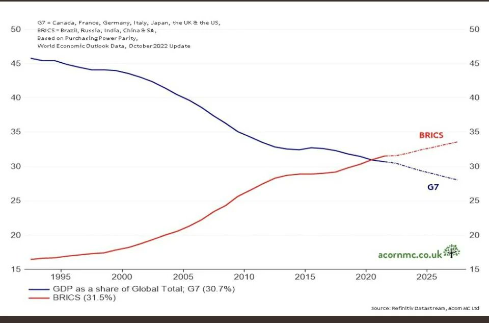 GDP của BRICS so với GDP của G7 năm 2023. Nguồn: Anthony Pompliano