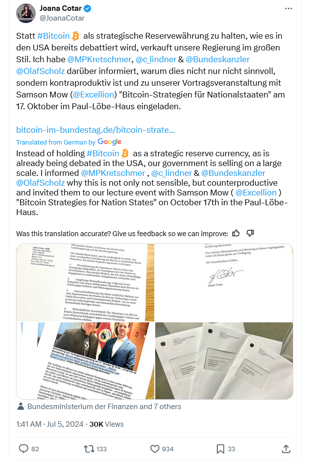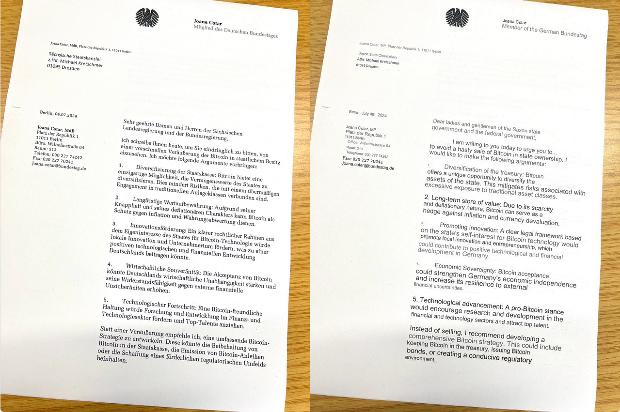 Việc bán tháo thêm Bitcoin hiện tại không “hợp lý” và “gây phản tác dụng” đối với quốc gia, Cotar cho biết. Bà cũng đã dùng bức thư để mời bốn chính trị gia Đức tham dự sự kiện “Chiến Lược Bitcoin cho Các Quốc Gia” vào tháng 10 năm 2023 để có thể thuyết phục các đồng nghiệp của mình.