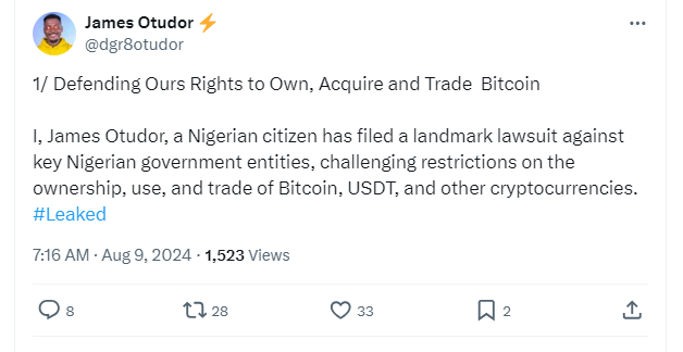 Nhà hoạt động tiền điện tử và chính trị gia người Nigeria, James Otudor, đã đưa ra một lập trường pháp lý táo bạo để đấu tranh cho quyền sở hữu, sử dụng và giao dịch Bitcoin, Tether và các loại tiền điện tử khác của người dân Nigeria.
