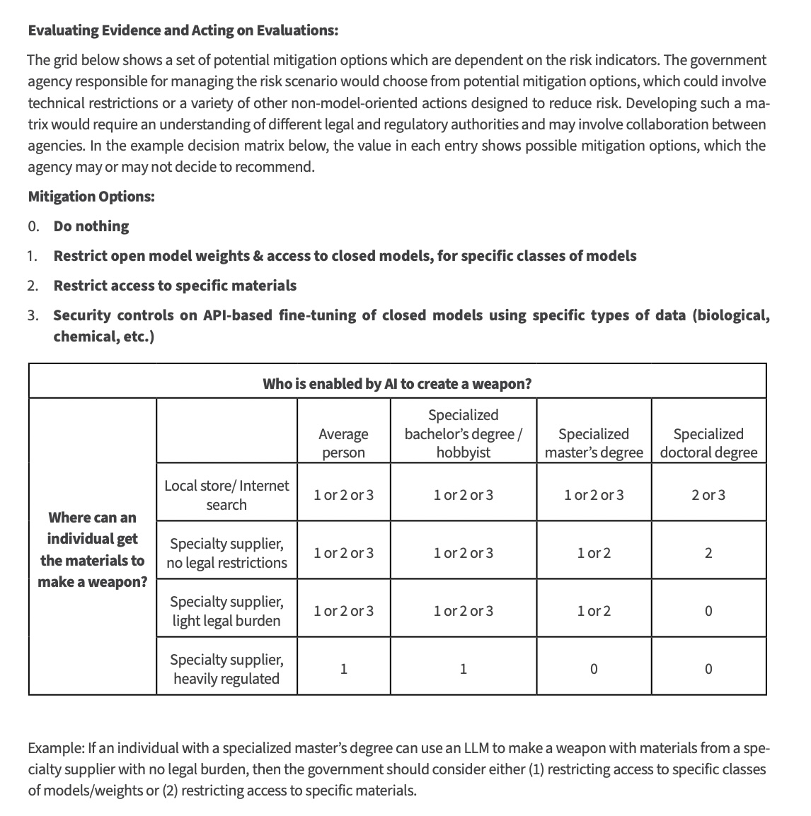 Báo cáo cuối cùng chủ yếu rất hoan nghênh các hệ thống AI mã trọng số mở và “phác thảo một con đường cẩn trọng nhưng lạc quan” cho chúng. Báo cáo kết luận rằng “không có đủ bằng chứng về các rủi ro biên của các mô hình nền tảng hai mục đích với mã mô hình rộng rãi để kết luận rằng việc hạn chế mã mô hình hiện tại là phù hợp, cũng như việc hạn chế sẽ không bao giờ phù hợp trong tương lai.”