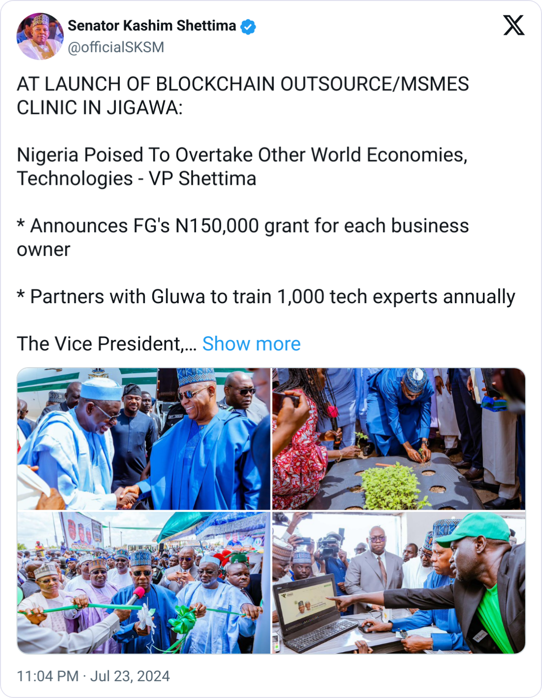 Vào ngày 23 tháng 7, Phó Tổng thống Nigeria, Kashim Shettima, đã khai trương Sáng kiến Đào tạo và Tư vấn về AI, Blockchain và Công nghệ tại thành phố Jigawa, như một phần trong chiến lược chuyển đổi số và lãnh đạo công nghệ của Nigeria ở châu Phi. Ông nói: