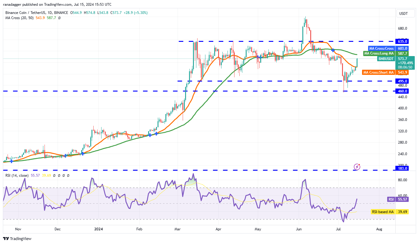 Các nhà đầu cơ sẽ cố gắng tiếp tục đợt tăng bằng cách đẩy giá lên trên SMA 50 ngày ($587). Nếu họ thành công, cặp BNB/USDT có thể đạt đến kháng cự trên $635, nơi các nhà bán khống sẽ cố gắng ngăn cản đợt tăng.