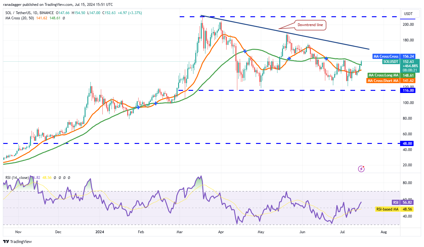 Có một kháng cự nhỏ ở mức $155, nhưng nếu vượt qua mức này, cặp SOL/USDT có thể đạt đến đường xu hướng giảm. Các nhà bán khống dự kiến sẽ bảo vệ mức này, vì sự phá vỡ trên nó sẽ vô hiệu hóa mô hình tam giác giảm dần đang phát triển. Sự thất bại của một mô hình giảm giá là dấu hiệu tích cực. Điều này có thể bắt đầu một đợt tăng lên $169 và sau đó lên $210.