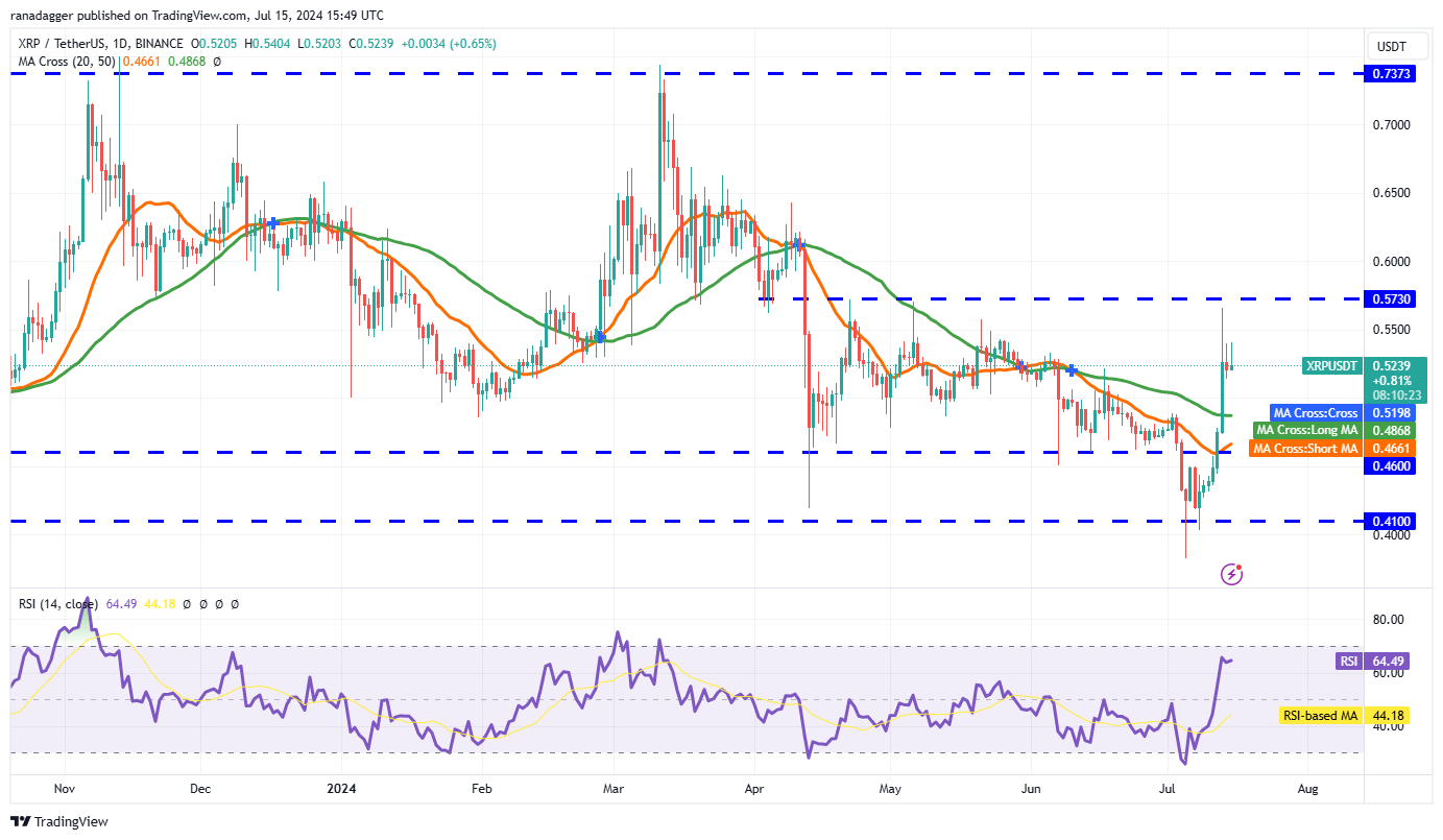 XRP đã tăng lên trên SMA 20 ngày ($0,46) vào ngày 12 tháng 7 và tiếp tục với một đợt tăng mạnh lên $0,57 vào ngày 13 tháng 7.