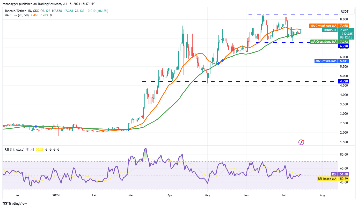 SMA 20 ngày ($7,46) đã phẳng ra, và RSI gần mức trung bình, cho thấy sự cân bằng giữa cung và cầu. Nếu người mua đẩy giá lên trên $7,72, cặp TON/USDT có thể tăng lên $8,29.