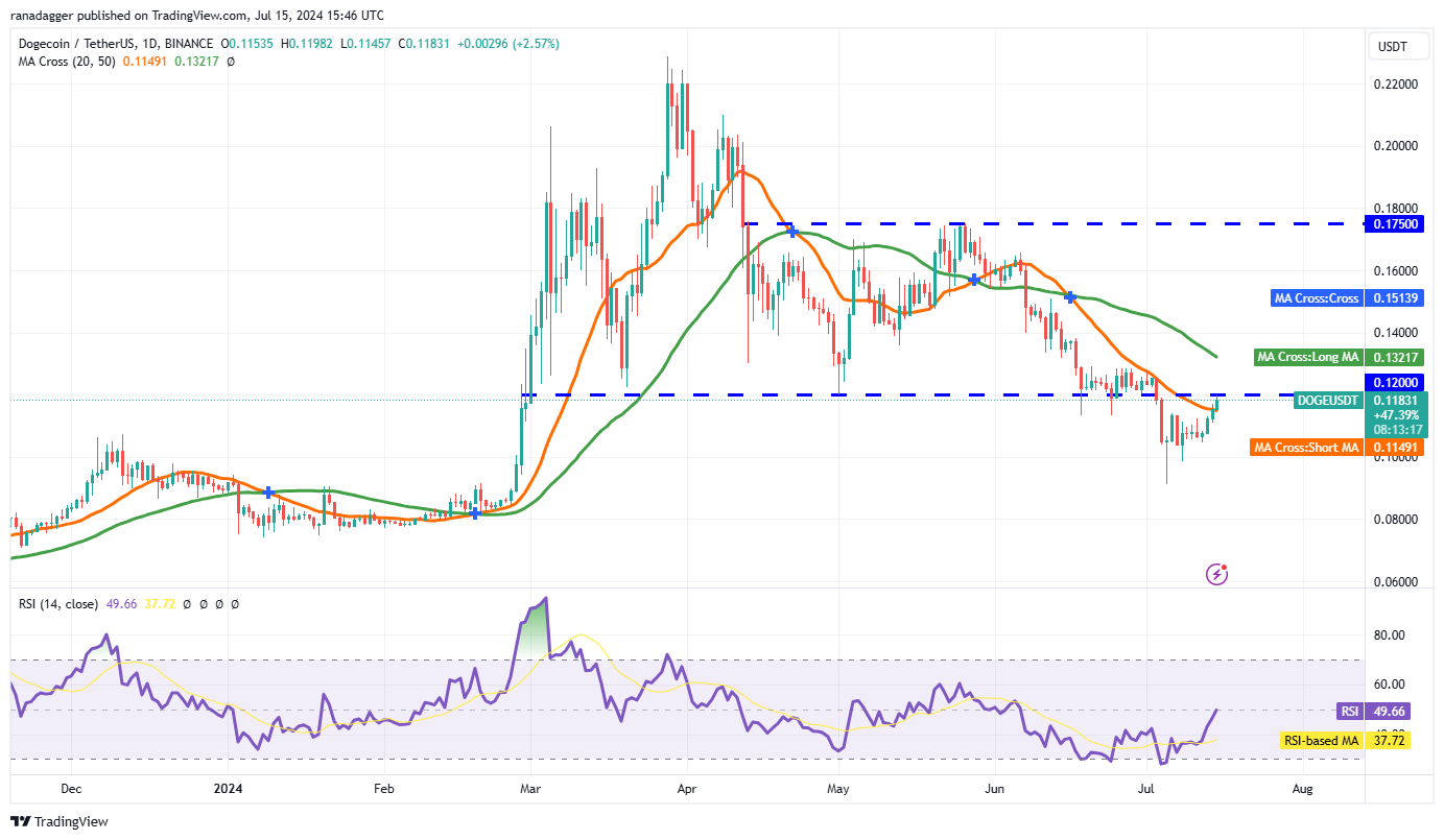 Nếu giá quay đầu mạnh từ $0,12, điều này sẽ gợi ý rằng các nhà bán khống đang cố gắng chuyển mức này thành kháng cự. Cặp DOGE/USDT có thể giảm xuống $0,10 và sau đó kiểm tra lại mức thấp $0,09 vào ngày 5 tháng 7. Dự kiến người mua sẽ bảo vệ mạnh mẽ khu vực hỗ trợ $0,09 đến $0,10.