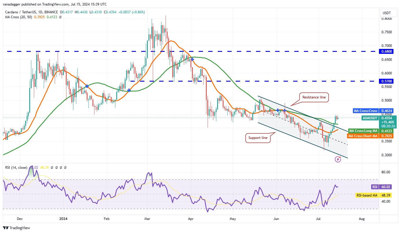 Cardano đã vượt qua kênh giảm giá vào ngày 12 tháng 7 và tiếp tục phá vỡ trên SMA 50 ngày ($0,41) vào ngày 13 tháng 7. Điều này cho thấy xu hướng giảm có thể đã kết thúc.