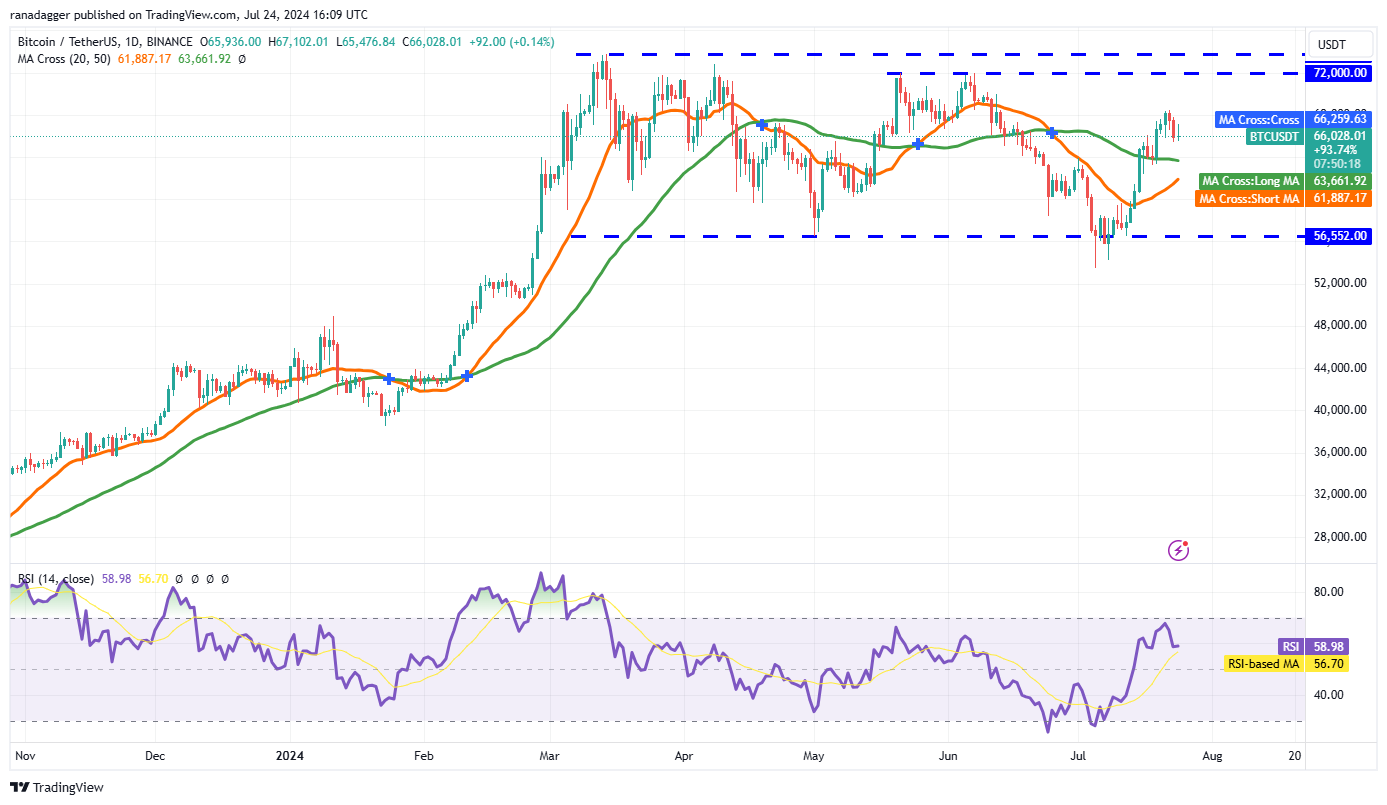 Các phe bò đang cố gắng bảo vệ mức $65,500, nhưng nếu không thành công, mức giảm xuống $62,000 là hoàn toàn có thể. Giá BTC vẫn đang dao động trong phạm vi từ $56,552 đến $73,777, cho thấy sự phân vân giữa phe bò và phe gấu về xu hướng tiếp theo. Trung bình di động 20 ngày ($61,887) và chỉ số sức mạnh tương đối (RSI) trong vùng tích cực cho thấy xu hướng ngắn hạn nghiêng về phe bò. Nếu phe bò thành công đẩy giá lên $73,777, họ có thể gặp phải kháng cự mạnh tại $70,000 và $72,000. Ngược lại, nếu mức hỗ trợ $65,000 bị phá vỡ, cặp BTC/USDT có thể giảm xuống các mức trung bình di động, mở ra khả năng giảm xuống $60,000.