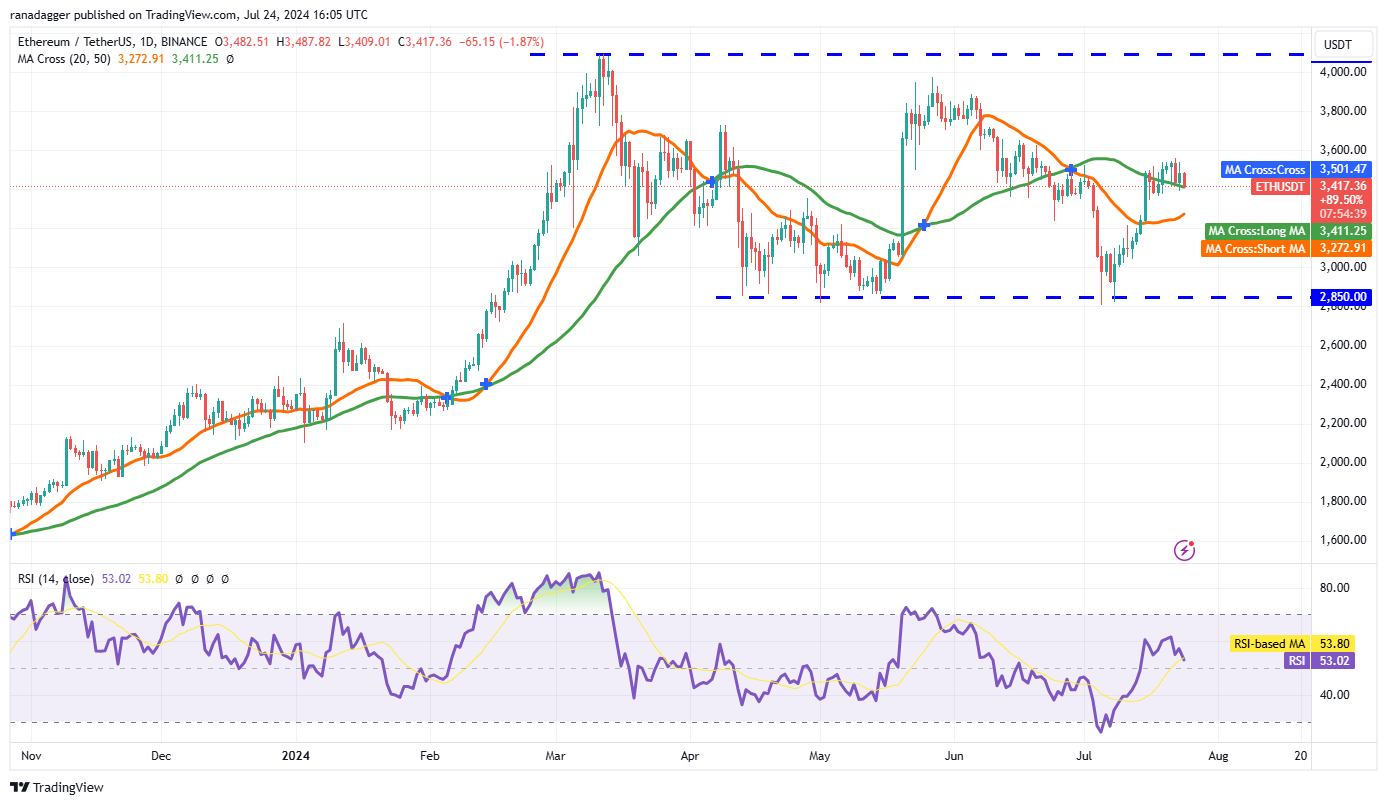 Ether đã bật lên từ trung bình di động 50 ngày ($3,411) vào ngày 23 tháng 7, nhưng phe bò đang gặp khó khăn trong việc duy trì đà tăng. Nếu giá giảm xuống dưới mức trung bình di động 50 ngày, cặp ETH/USDT có thể giảm về mức trung bình di động 20 ngày ($3,272). Mức hỗ trợ này rất quan trọng, vì nếu bị phá vỡ, việc bán tháo có thể gia tăng và cặp này có thể giảm về $3,000. Ngược lại, nếu giá bật lên từ mức hiện tại và vượt qua $3,563, xu hướng ngắn hạn sẽ vẫn tích cực và cặp này có thể tăng lên $3,722 và tiếp theo là $4,000. Các nhà bán lẻ được dự đoán sẽ bảo vệ mạnh mẽ khu vực $4,000 đến $4,094.