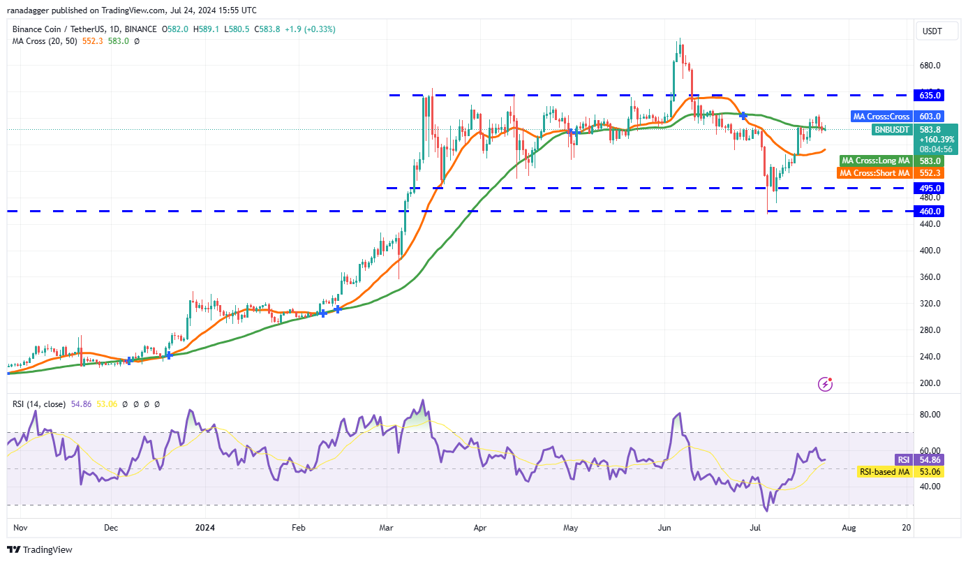 Phe bò đã cố gắng đẩy BNB lên mức kháng cự ở $635, nhưng phe gấu đã kéo giá trở lại mức trung bình di động 50 ngày ($583). Nếu giá phục hồi mạnh mẽ từ mức này, điều đó cho thấy phe bò đang mua vào mỗi khi giá giảm nhẹ. Điều này có thể cải thiện triển vọng phá vỡ mức $635 và cặp BNB/USDT có thể tăng lên $722. Ngược lại, nếu giá phá vỡ và đóng cửa dưới mức trung bình di động 50 ngày, điều đó cho thấy phe gấu đang cố gắng giữ giá trong phạm vi $495 đến $635 thêm một thời gian. Cặp này có thể giảm xuống mức trung bình di động 20 ngày ($552).