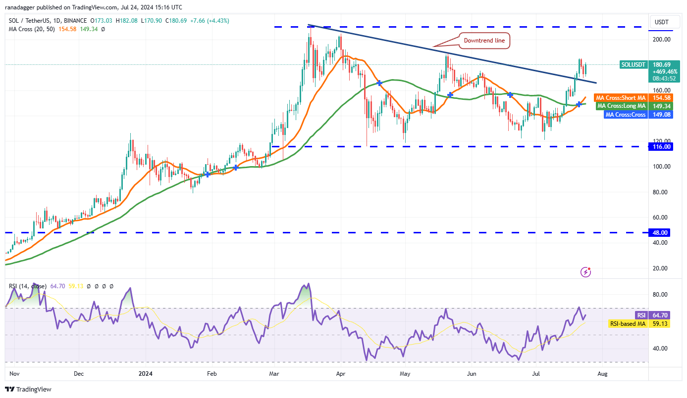 Solana đã giảm từ mức $185 vào ngày 22 tháng 7 và hiện đang kiểm tra mức phá vỡ từ tam giác giảm dần. Trung bình di động 20 ngày ($154) và RSI trong vùng tích cực cho thấy phe bò đang kiểm soát. Nếu giá bật lên từ mức hiện tại và vượt qua $185, cặp SOL/USDT có thể đạt $210. Tuy nhiên, nếu giá quay trở lại tam giác, phe gấu sẽ có lợi thế hơn sau khi đẩy giá xuống dưới các mức trung bình di động, điều này có thể chỉ ra rằng mức phá vỡ gần đây có thể là một cái bẫy bò.