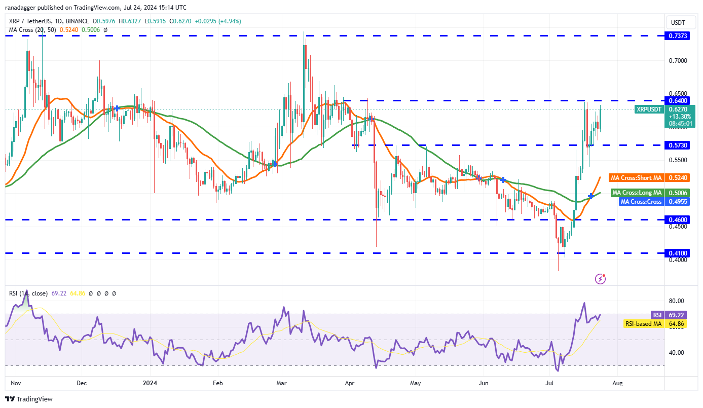 Phe gấu đã cố gắng kéo XRP xuống dưới hỗ trợ $0.57 vào ngày 23 tháng 7, nhưng phe bò đã giữ vững vị trí của mình. Việc mua vào đã gia tăng vào ngày 24 tháng 7, và phe bò đang cố gắng vượt qua rào cản $0.64. Nếu thành công, cặp XRP/USDT có khả năng gia tăng động lực và tăng lên mức kháng cự mạnh $0.74. Nếu phe gấu muốn ngăn chặn sự tăng giá, họ sẽ phải bảo vệ thành công mức $0.64 và kéo cặp này xuống dưới $0.57. Nếu làm được điều đó, cặp này có thể giảm xuống mức trung bình di động 20 ngày ($0.52).