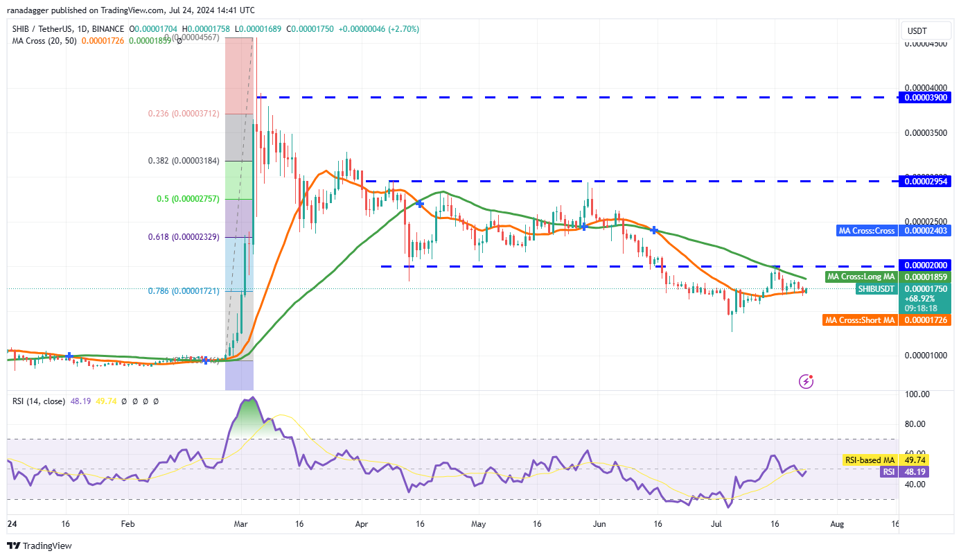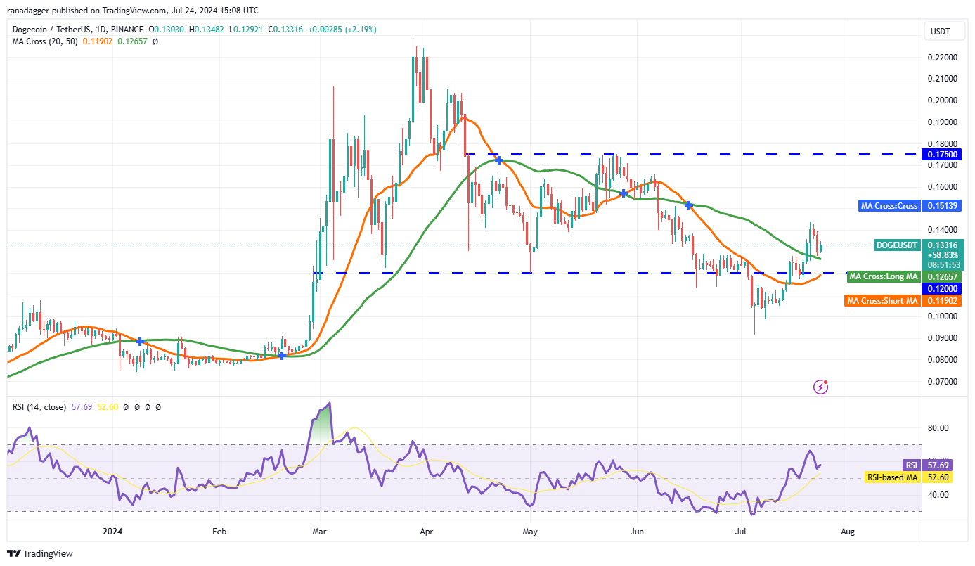 Dogecoin đã giảm về mức trung bình di động 50 ngày ($0.13) vào ngày 23 tháng 7, điều này có thể thu hút người mua. Trung bình di động 20 ngày ($0.12) đã bắt đầu tăng, và RSI trong vùng tích cực cho thấy phe bò có chút lợi thế. Nếu sự phục hồi từ mức trung bình di động 50 ngày duy trì, phe bò có thể đẩy cặp DOGE/USDT lên $0.15 và sau đó là $0.18. Ngược lại, nếu mức trung bình di động 50 ngày bị phá vỡ, điều này sẽ báo hiệu rằng phe gấu đã chiếm ưu thế. Cặp này có thể giảm xuống mức trung bình di động 20 ngày, vốn cũng có khả năng đóng vai trò hỗ trợ. Nếu phá vỡ mức này, lợi thế sẽ nghiêng về phe gấu.