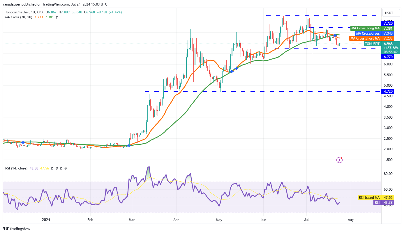 Toncoin đã giảm xuống mức hỗ trợ của phạm vi ở $6.77, đây là mức quan trọng cần theo dõi. Sự phục hồi yếu từ mức hiện tại sẽ báo hiệu sự thiếu mua vào mạnh mẽ, làm gia tăng khả năng phá vỡ dưới $6.77. Nếu điều đó xảy ra, cặp TON/USDT có thể hoàn thành mô hình đỉnh đôi và bắt đầu giảm về $6 và sau đó là $5.50. Ngược lại, nếu giá bật lên mạnh mẽ từ mức hiện tại, điều này sẽ báo hiệu nhu cầu mạnh mẽ từ phe bò. Cặp này có thể tăng lên $7.72, nơi phe gấu dự kiến sẽ tăng cường phòng thủ.